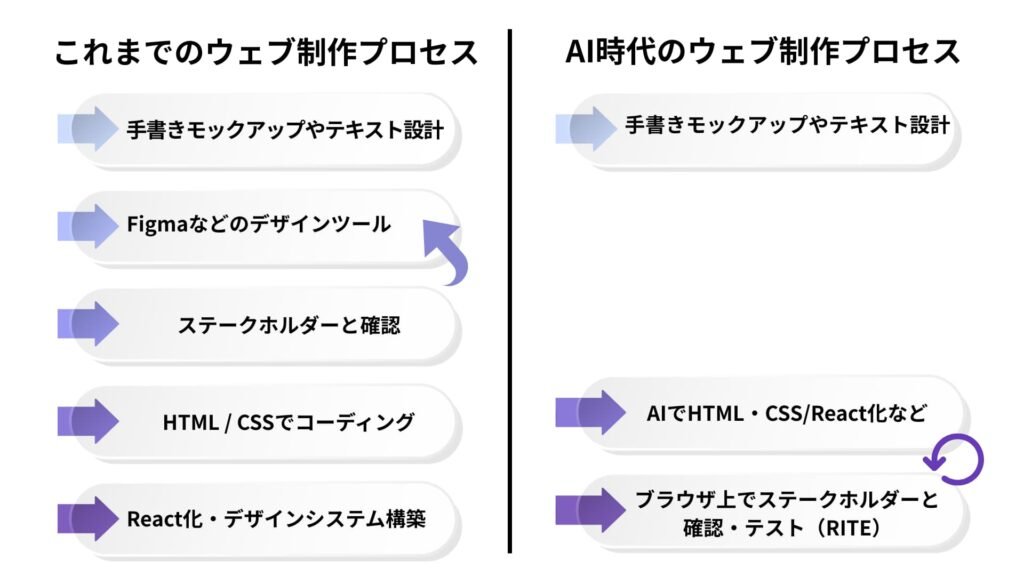 もちろん、Figmaでも生成可能ですが、Figmaを使う必要すらないケースも増えています。つまり、Figma中心の制作プロセスに依存している企業は、今後組織レベルの変革を迫られることになるのです。