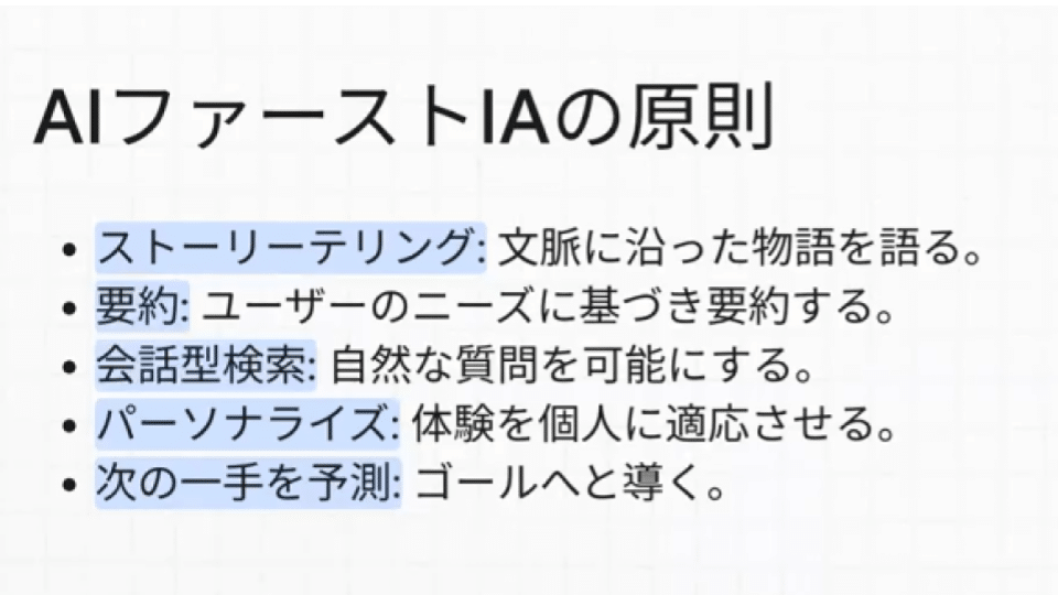 - IAがあるAI(AIファーストな設計):ユーザーの「今日は何をしに来ましたか?」という目的を問いかけ、状況に合わせて必要な情報を適切に提示できる