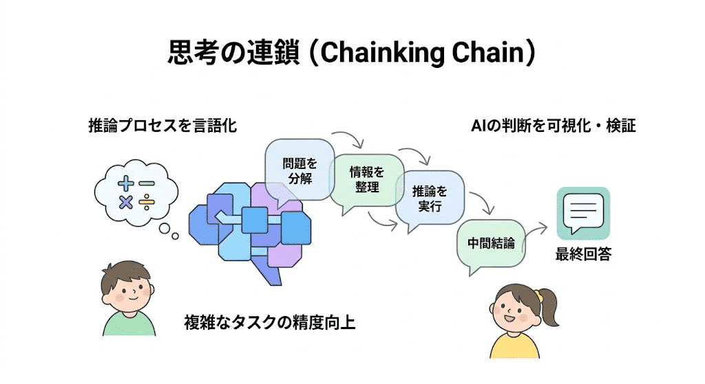 CoTの最大の価値は、AIの思考という「ブラックボックス」に光を当て、その出力の妥当性を人間が検証できるようにする点にある。思考のプロセスが言語化されるため、なぜその結論に至ったのかを追跡し、誤りがあれば特定しやすくなる。これにより、人間はAIの出力を鵜呑みにせず、批判的に検討しながら協働するための基盤を得られる。この仕組みは、主に二つの形式で実現される。