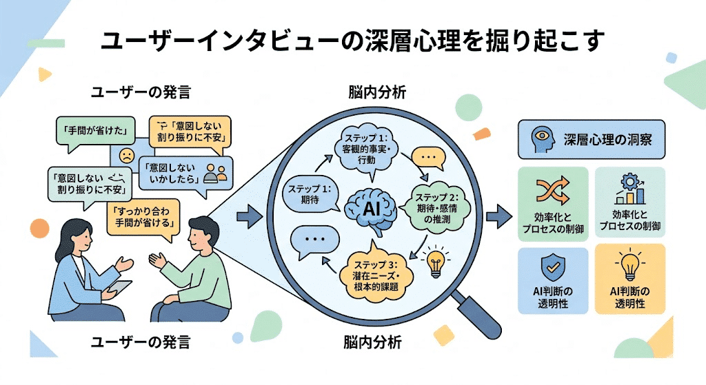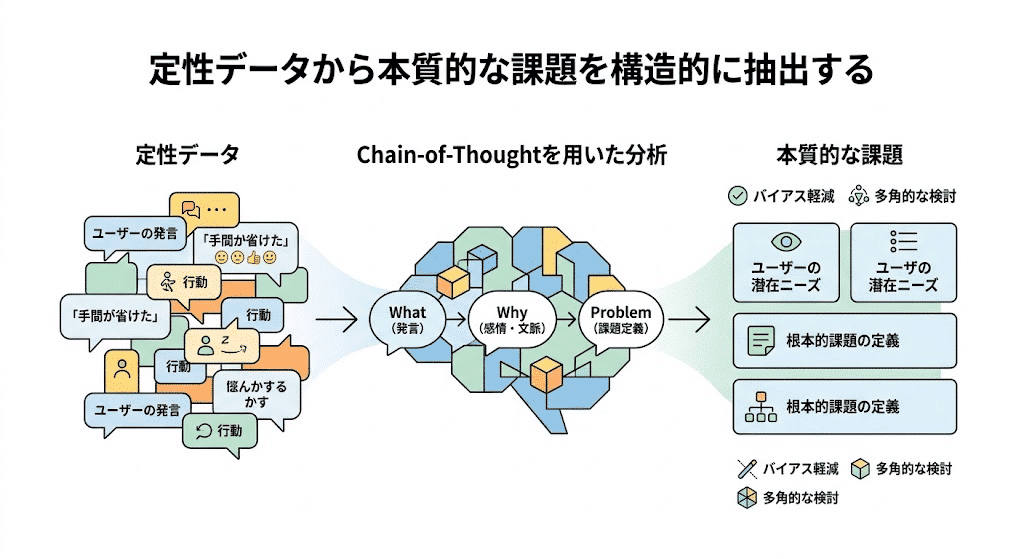 CoTは、ユーザーリサーチで得られた定性的なデータを分析し、本質的な課題を抽出するプロセスで強力な役割を果たす。特に、ユーザーインタビューの書き起こしや自由記述アンケートといった、構造化されていないテキスト情報から意味のある洞察を見つけ出す初期分析段階で有効である。ここでのCoTの役割は、単なる要約を超え、分析者の思考をシミュレートし、洞察に至るまでの論理的な道筋を構築することにある。ユーザーの発言(What)から、その背景にある文脈や感情(Why)を読み解き、最終的に解決すべき課題(Problem)を定義する思考プロセスをプロンプトとして設計することで、分析者個人のバイアスを減らし、多角的なデータ検討を支援する。