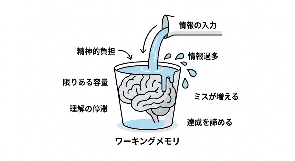 認知負荷とは、人が何かを学んだり課題をこなしたりする際に、情報を一時的に記憶し処理する「ワーキングメモリ」にかかる精神的な負担の量を指す。人間の情報処理能力には限界があるため、この負荷が過剰になると理解が滞り、ミスが増え、最終的には目的の達成を諦めてしまう。