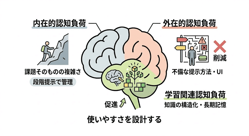 課題そのものが持つ、本質的な複雑さに起因する負荷。例えば、初めて自転車に乗るときのバランス感覚の習得などがこれにあたる。この負荷は完全にはなくせないが、情報を段階的に提示することで管理しやすくなる。