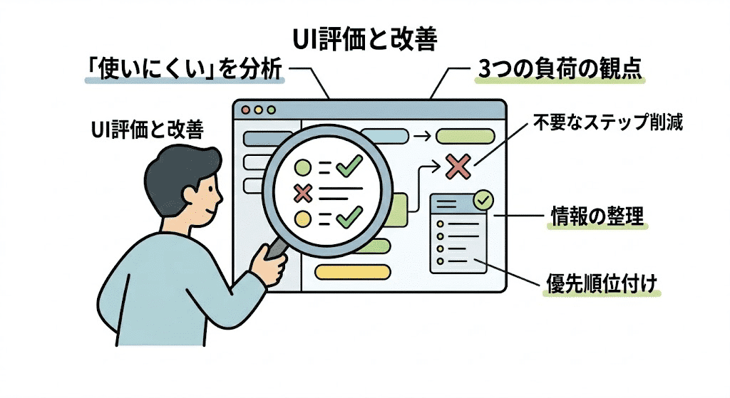 このように認知負荷を評価軸とすることで、UIが利用者に与える精神的負担を構造的に分析し、改善の優先順位付けを論理的に行うことが可能になる。