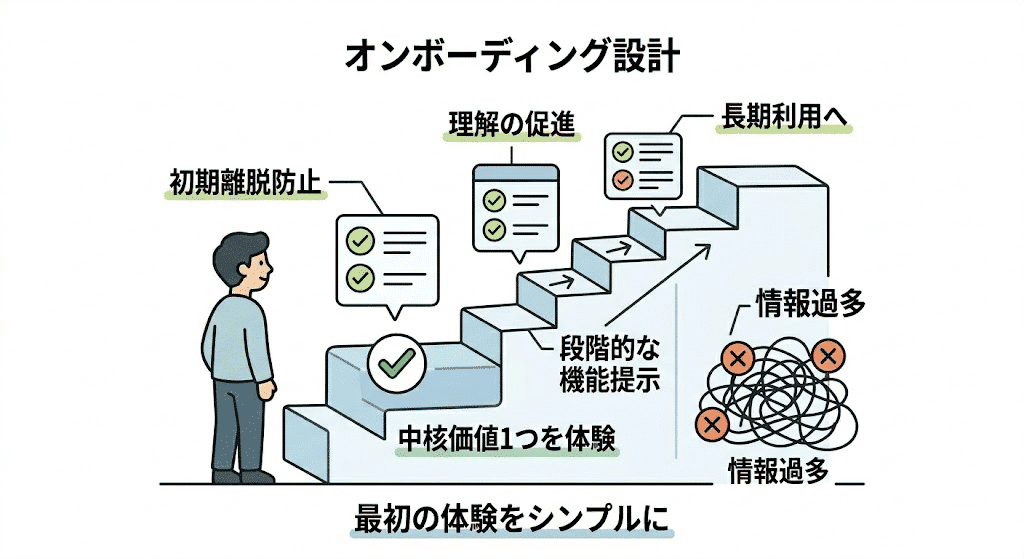 これに対し、認知負荷の観点を応用すれば、オンボーディングの目的を「利用者が製品の中核的な価値を一つだけ体験すること」に再定義できる。最初のセッションでは、その価値を実現する最小限の操作のみを案内し、内在的負荷を低く抑える。他の機能は利用者が慣れたタイミングで段階的に提示することで、不要な外在的負荷をなくし、利用者が自身のペースで学んでいくための学習関連負荷を促進する。