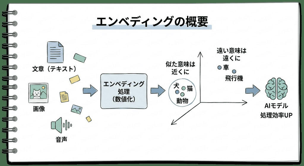 エンベディングとは、単語や文章、画像といったあらゆるデータを数値の空間に並べ替える技術である。データが空間上の数値に変わると、性別や感情、時間軸といったデータ固有の特徴や意味を持つようになる。例えば「犬」と「猫」のように似た意味を持つものは互いに近くに配置され、意味的に遠いものは離れて置かれる。このおかげで、バラバラだったデータが整理され、AIモデルの処理効率を大幅に高めることができる。