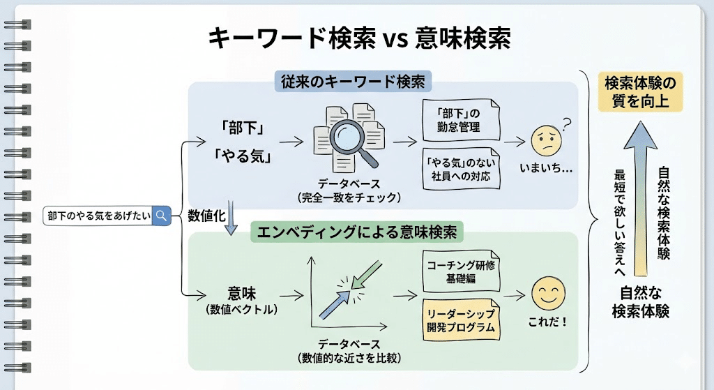 例えば、ユーザーが「部下のやる気をあげたい」検索した場合、従来のようなWebのキーワード検索だと「”部下”の勤怠管理」「”やる気”のない社員への対応」など、言葉だけで探すことになる。しかし、エンベディングによる検索なら、ユーザーの文脈と近い情報として「コーチング研修 基礎編」「リーダーシップ開発プログラム」などの上司側のスキルアップに関する情報を提示する。