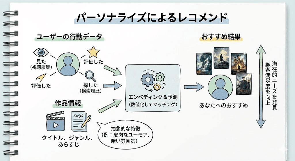 エンベディングを使う代表的な事例は、動画配信サービスが提供する、利用者一人ひとりに合わせた作品おすすめ(パーソナライズ)機能である。たとえば、Netflixなどのサジェスト(推薦・提案)機能では、利用者の「見た」「評価した」「探した」という行動データや、映画・ドラマのタイトル、あらすじ、ジャンルといった作品の情報を、すべて「数字」に変える。その利用者のニーズに近い作品を数値上の計算で予測できる。