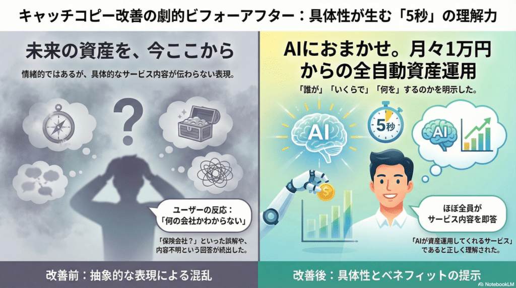 ある資産運用サービスで5秒テストを取り入れた結果、キャッチコピーを改善した例を紹介する。