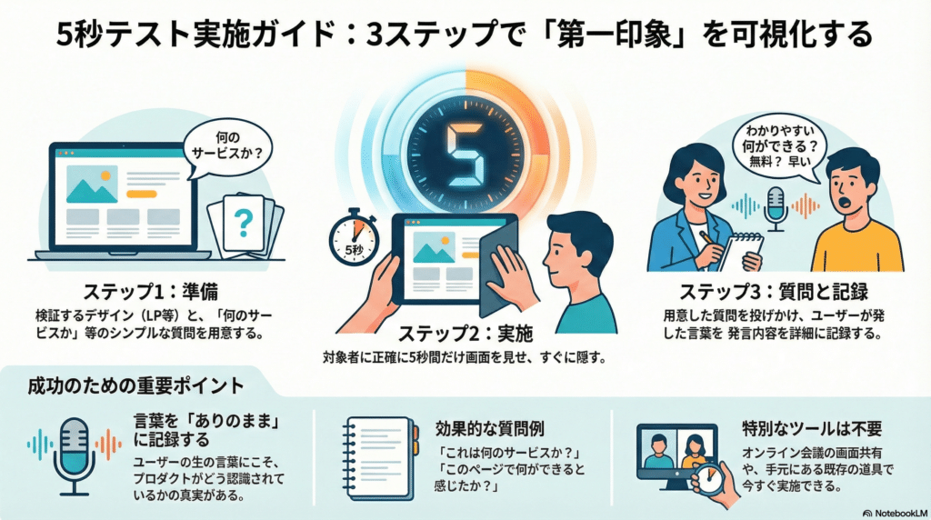 1. 準備: 検証したいデザイン(LPのトップ画面など)と、シンプルな質問を用意する。(質問例:「これは何のサービスだと思いましたか?」「このページで何ができると感じましたか?」)