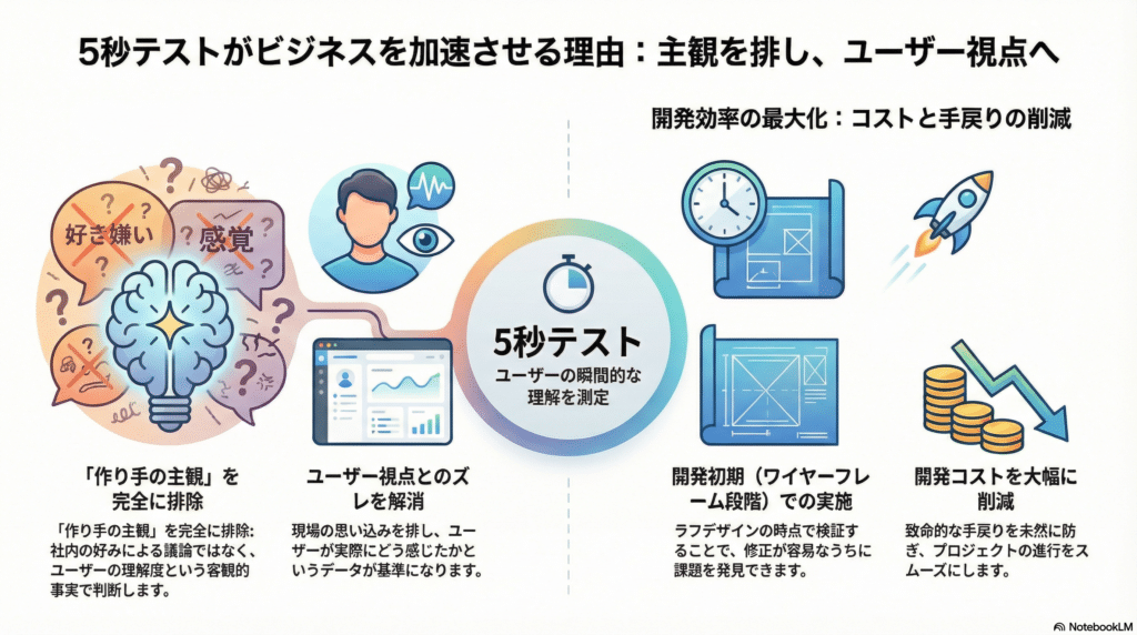 5秒テストを行えば、こうした議論は不要になる。「ユーザーは5秒で理解できなかった」という客観的な事実(データ)がすべてだからだ。特に開発の初期段階、ワイヤーフレームやラフデザインの時点で行うことで、致命的な手戻りを防ぎ、開発コストを大幅に削減できる。