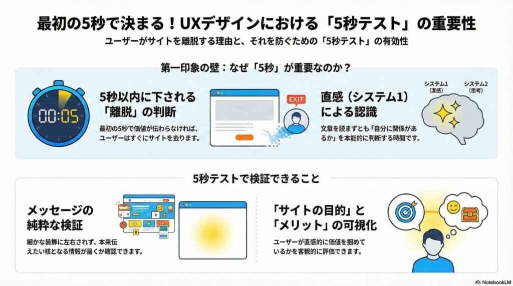 5秒テストは、この「第一印象」の勝負に勝つための、シンプルかつ強力な手法である。