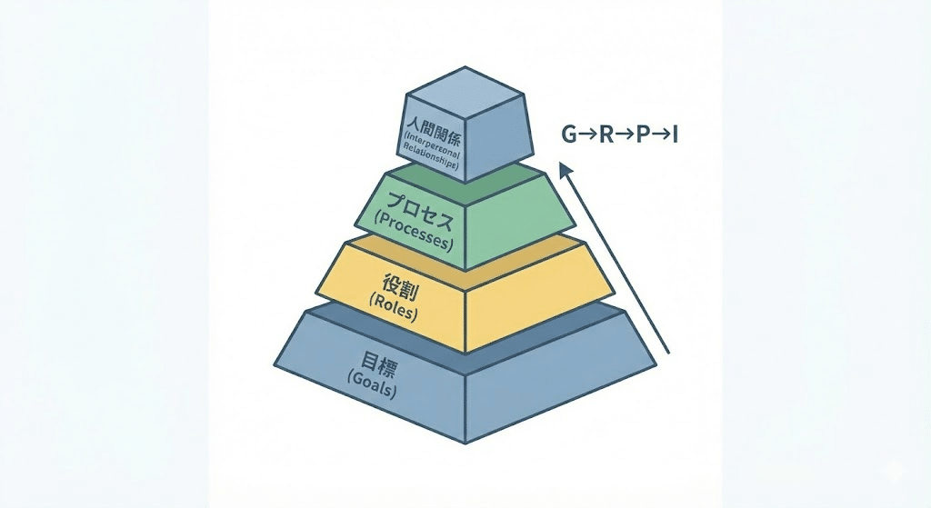 表面的な人間関係の対立(I)ではなく、その原因となりうるプロセス(P)や役割(R)、さらには目標(G)の不一致へと遡って検証できるため、問題の根っこにアプローチできる。