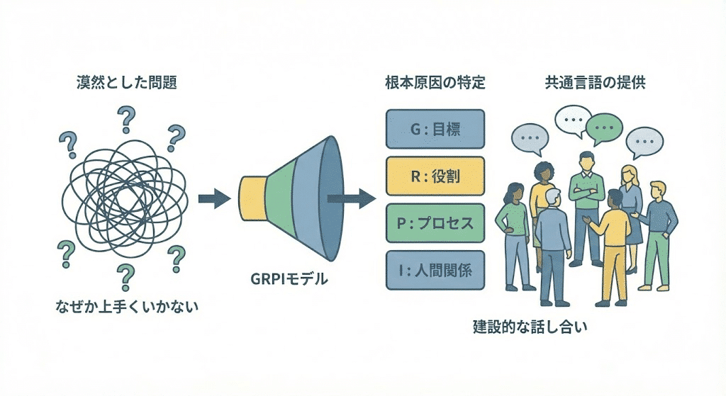 GRPIモデルが提供する最大の価値は、チームが抱える漠然とした「なぜか上手くいかない」という問題を、具体的な課題に分解できる点にある。