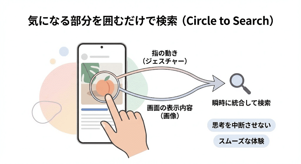 マルチモーダルAIの具体的な応用例として、スマートフォンの「かこって検索」機能が挙げられる。これは、画面に表示されている画像や文章の気になる部分を指で囲むだけで、それに関する情報をAIが自動で検索してくれる機能である。この体験は、ユーザーが「知りたい」と思った対象を示す「指の動き(ジェスチャー)」と、その背景にある「画面の表示内容(画像)」という二つの情報をAIが瞬時に統合することで成り立っている。従来のようにスクリーンショットを撮って別のアプリで検索する手間がなくなり、思考を中断させずに探求を続けられる、非常にスムーズな体験が設計されている。