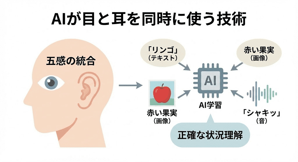 人間は五感を使い、目から入る視覚情報と耳から入る聴覚情報を脳内で自然に結びつけて世界を認識している。マルチモーダルAIは、この仕組みをコンピュータ上で再現しようとする試みである。例えば、「リンゴ」というテキスト情報だけでなく、赤い果物の「画像」や、シャキッとした咀嚼「音」を関連付けて学習する。これにより、単一の情報だけでは得られない、より豊かで正確な状況理解が実現する。従来のAIが主にテキストという一つの情報源に頼っていたのに対し、マルチモーダルAIは複数の情報源を統合することで、より人間らしい柔軟な思考に近づいている。