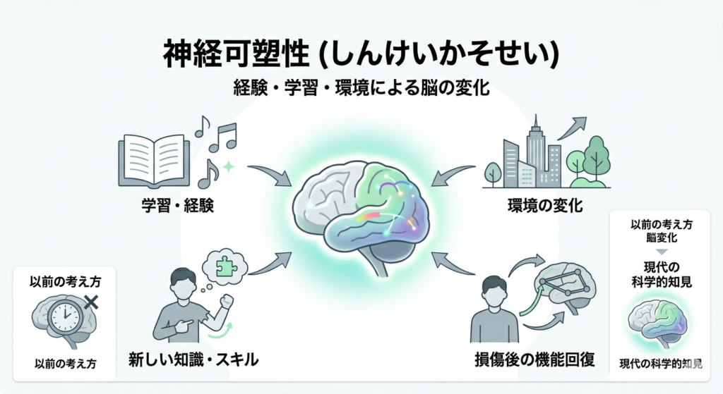 昔は、脳は大人になるとほとんど変わらないと考えられていた。だが研究が進み、脳は大人になってからも、使い方や受ける刺激によって変わり続けることがわかってきた。新しい知識を覚えること、体の動かし方を身につけること、けがや病気のあとに機能を補うことは、すべてこの性質と深く関係している。
