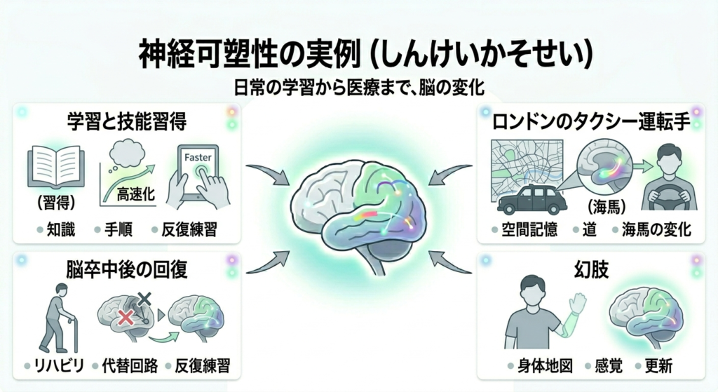 ロンドンのタクシー運転手は、道を覚えるために空間記憶を日常的に使う。その結果、海馬の一部に変化が見られたという研究がある。長い経験が脳の形や働きに関係することを示す代表的な例である。