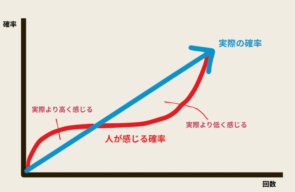 すなわち、人間は 低い確率を実際よりも大きく見積もり、一方で 高い確率を実際よりも小さく見積もるという心理的特性を持つ。