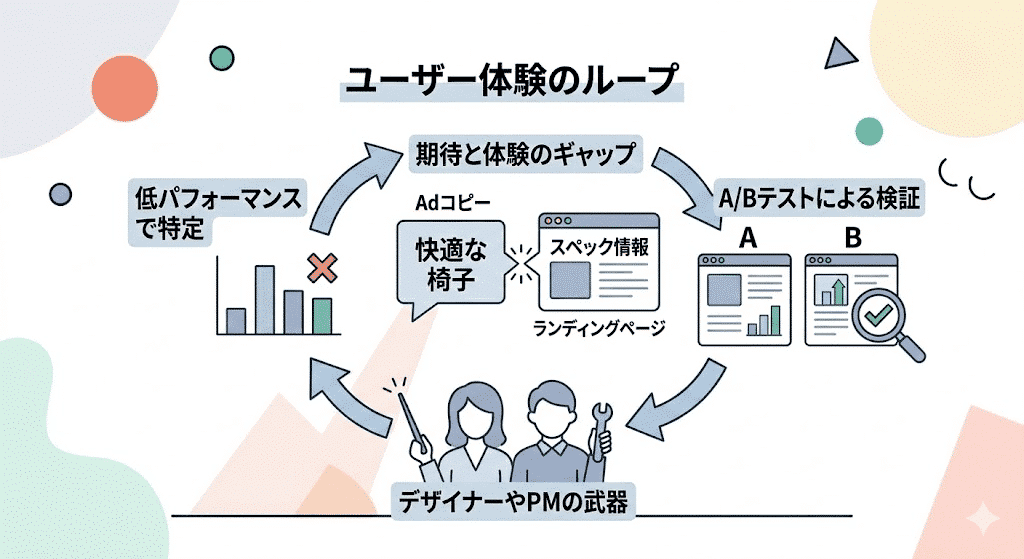 ROASは、広告運用者だけの指標ではない。デザイナーやプロダクトマネージャーがユーザー体験を改善するプロセスにおいても、強力な武器となる。具体的な実践フローは以下の通りである。