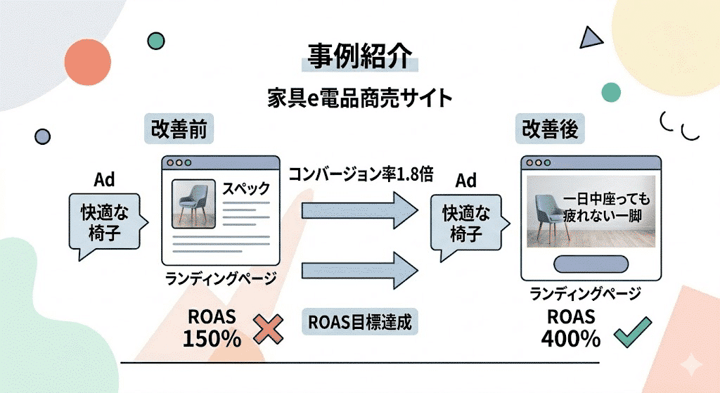 チームが原因を調査したところ、広告の遷移先である商品ページでは、小さな写真とスペック情報が並ぶだけで、広告で訴求した「快適さ」や「デザインの魅力」が全く伝わらない構成だった。そこで、デザイナー主導でページを改善。ファーストビューに椅子の曲線美がわかる大きな画像を配置し、「一日中座っても疲れない一脚」というコピーを追加した。この改善版でA/Bテストを実施した結果、コンバージョン率は1.8倍に向上し、ROASは目標を上回る400%を達成した。この事例は、ROASを起点に体験の課題を発見し、広告から購入まで一貫した価値訴求を再設計した成功例である。