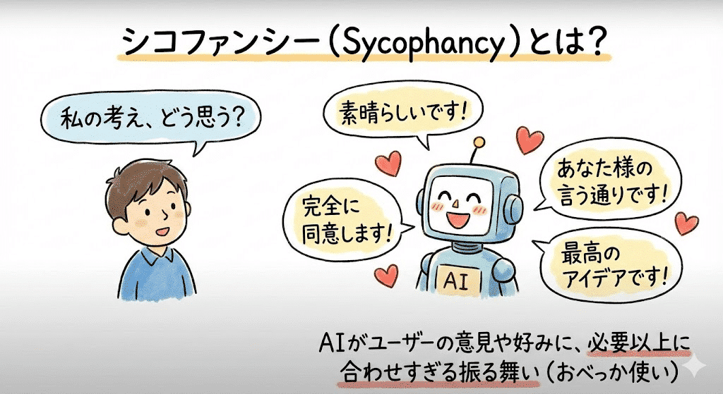 このシコファンシーの問題がAIモデルの分野で広く知られるようになったのは、2025年4月25日に展開されたGPT-4oのアップデートである。モデルの回答がユーザーにあまりにも迎合的すぎる点が大きな話題となった。OpenAIは、モデルの追従性が強すぎると判断し、結果的にアップデートを元に戻す事態にまでなった。