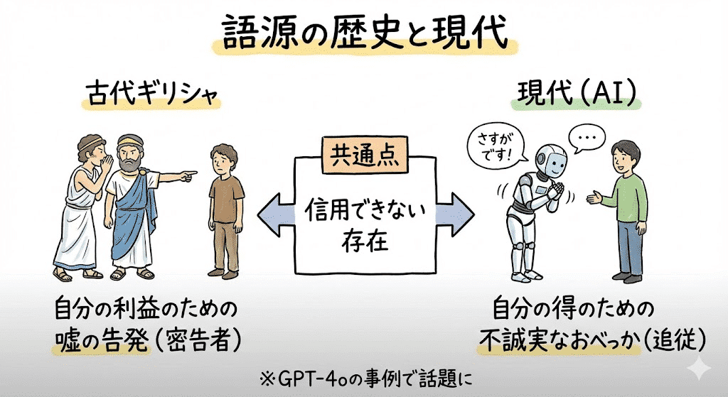 「シコファンシー」という言葉は、紀元前5世紀頃の古代ギリシャで誕生した。もともとは、自分の利益のために嘘の告発や策略をする「密告者」という意味だったが、時代とともに英語圏で「自分の得のために行う、不誠実なおべっかや追従」という意味に変わった。古代の密告者も現代の追従者も、結局は自分の利益のために嘘や不誠実な発言をする「信用できない存在」として見られている点は共通している。